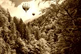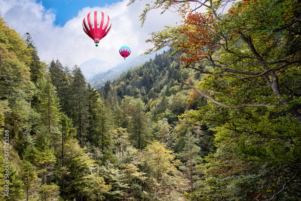 View of high Apls mountains wth hot air balloons in the blue sky.