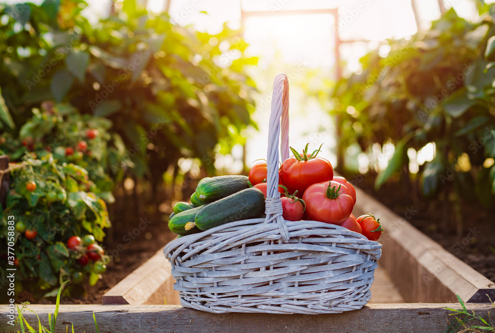 Ripe tomatoes and cucumbers in a basket on the background of the greenhouse and garden