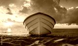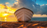Tropical Seascape with a boat on sandy beach at cloudy sunrise or sunset