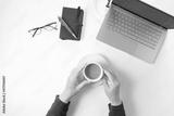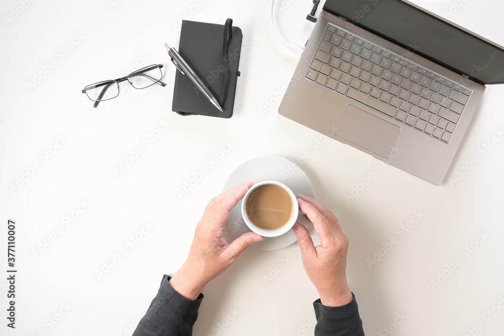 Elderly hands holding a coffee cup on a white office desk with laptop, notebook, pen and glasses, copy space, high angle view from above