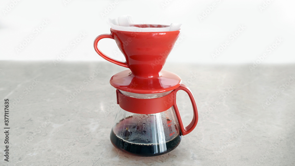 Pourover. V60. Fresh hot coffee filter dripping into the glass server