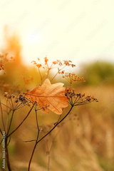 autumn nature background with oak leaf and dry grass. fall seasonal landscape.