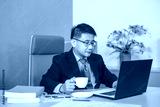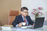 Asian business man working on laptop computer with business document with a cup of coffee in the office
