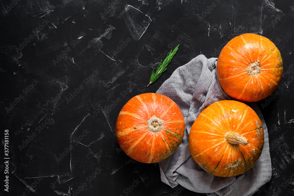 Raw pumpkins on a black stone background. Top view, flat lay. Thanksgiving and halloween.