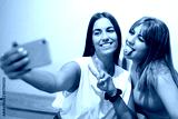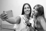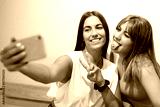 Two friends take a picture while having a coffee in a coffee shop.