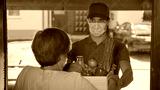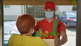 CLOSE UP: Man wearing facemask brings fresh organic produce to senior lady.