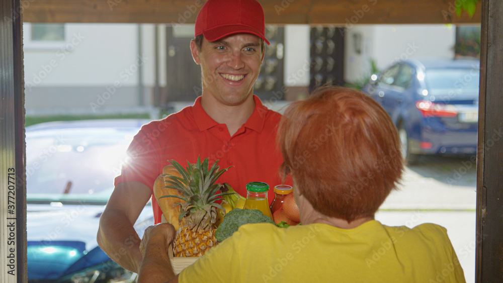 CLOSE UP: Smiling courier wearing a red shirt delivers groceries to senior woman