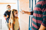 teacher taking a children temperature with a thermometer during covid pandemic.