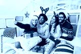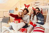 Friends on a large bed, exchanging Christmas presents; enjoying, happy, smiling