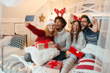 Friends on a large bed, exchanging Christmas presents; enjoying, happy, smiling