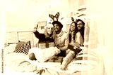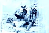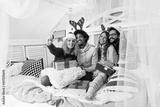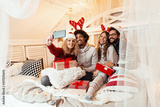 Friends on a large bed, exchanging Christmas presents; enjoying, happy, smiling