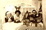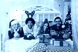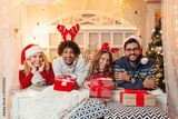 Friends on a large bed, exchanging Christmas presents; enjoying, happy, smiling