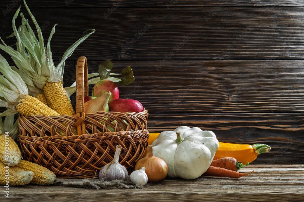 traditional autumn set of ripe vegetables and fruits with a wicker basket on rough boards on a dark wooden background. artistic conceptual rustic still life with side light and a copy of the space.