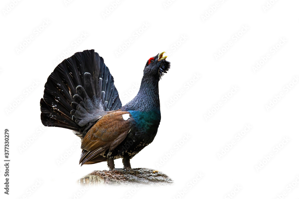 Western capercaillie, tetrao urogallus, lekking in nature isolated on white background. Endangered bird with large tail showing cut out on blank. Wild feathered grouse courting with copy space.