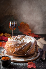 Bundt cake with saffron and rum covered with white glaze on rustic background with autumn decorations