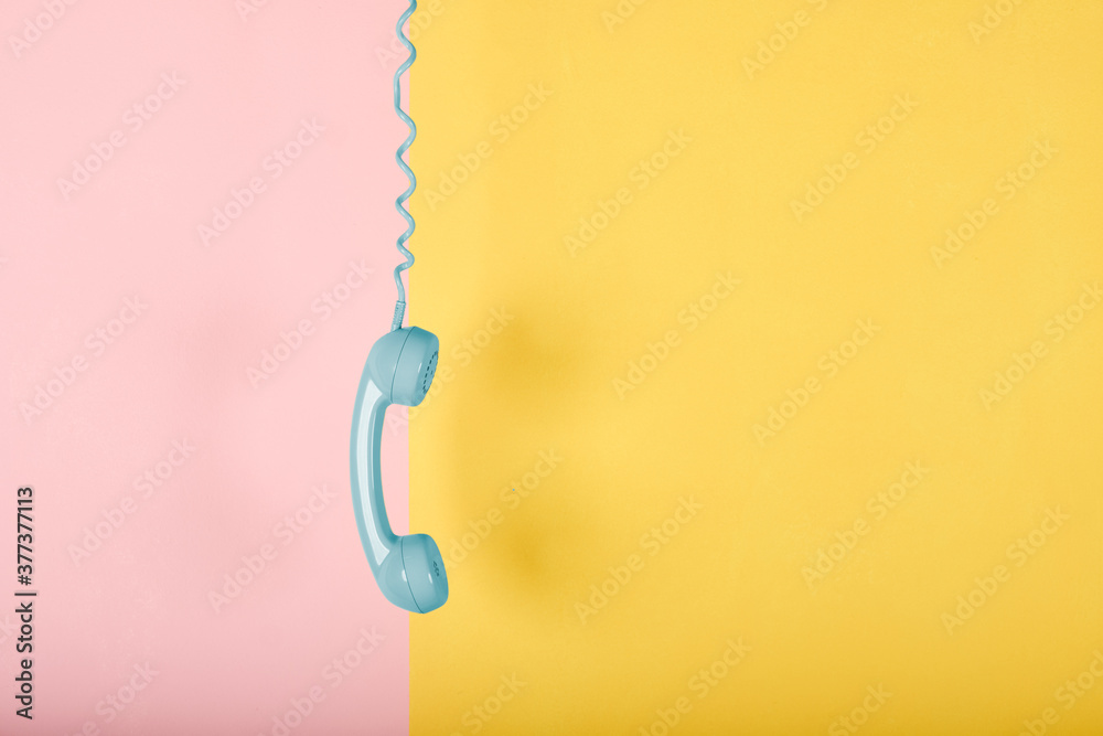 blue vintage telephone hanging on yellow and pink background