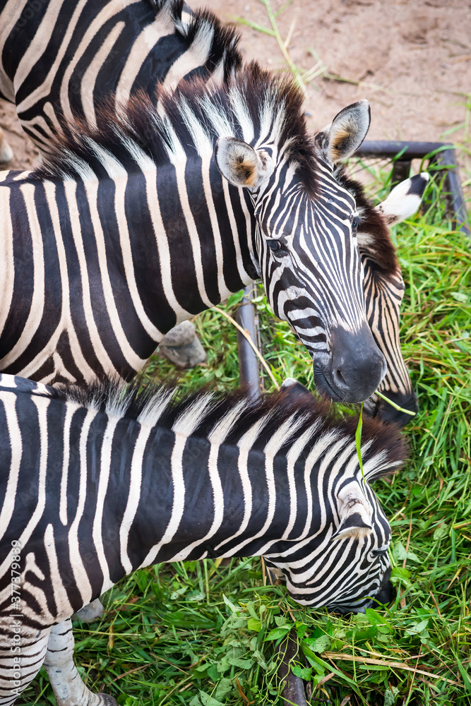 Three zebras eating grass in a stable.