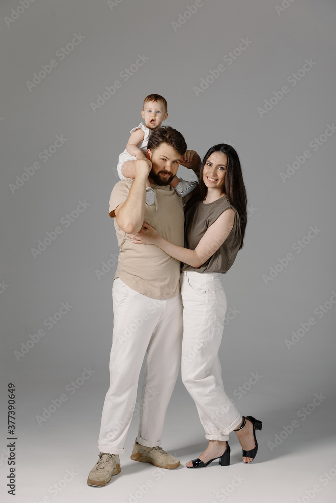 Portrait of young happy man and woman holding newborn cute babe dressed in white unisex clothing. Caucasian smiling father and mother embracing tenderly adorable new born child. Happy family concept