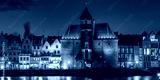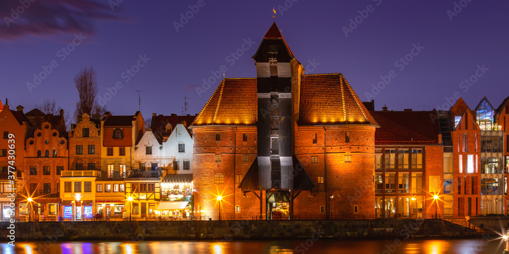 Old harbour crane and city gate Zuraw in old town of Gdansk at night, Poland