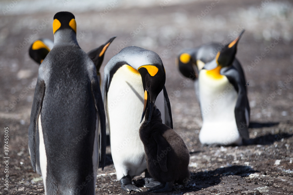 King Penguin (Aptenodytes patagonicus) feeding a chick, Saunders Island.