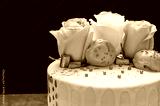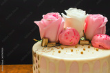 Hermoso pastel decorado con rosas naturales y chocolates, sobre mesa de madera. Hecho en casa.