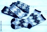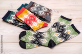 Colorful collection of elastic socks for sports and leisure. Wooden background, studio shot.