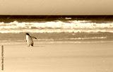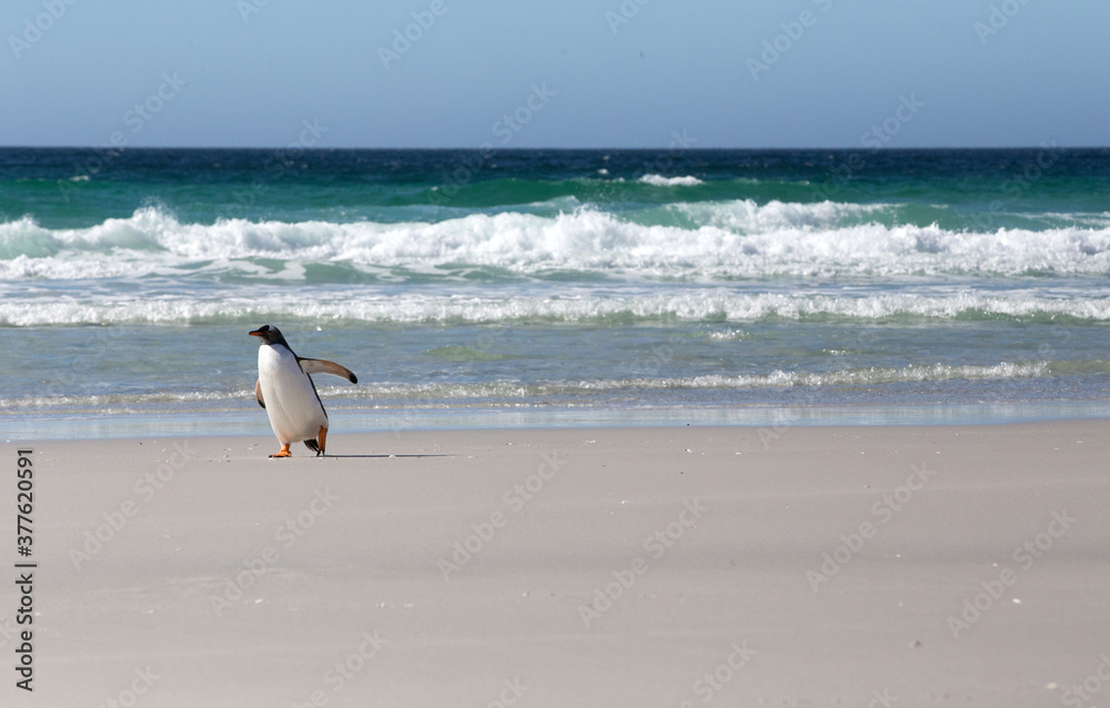 A lone Gentoo Penguin (Pygoscelis papua) walking along the beach. Saunders Island, Falkland Islands.