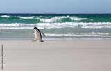 A lone Gentoo Penguin (Pygoscelis papua) walking along the beach. Saunders Island, Falkland Islands.