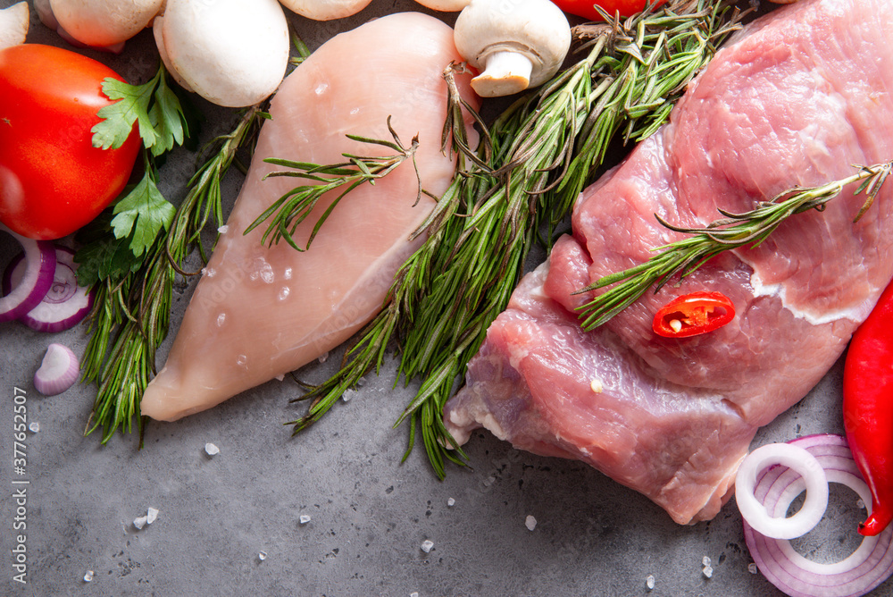 pork , meat, vegetables, pieces of raw chicken fillet, herbs, tomato, onion, rosemary, chili pepper, mushrooms on a gray