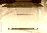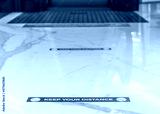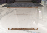 Social distancing sign with keep your distance warning on floor for safety in queuing , walking or entering to escalator or stair in shopping mall for covid-19 pandemic prevention
