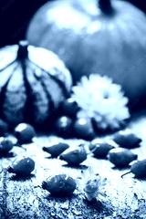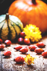 Rose hip, dried flower, gourd and pumpkin in background. Autumn harvest festival. Red dog rose berry herb. Thanksgiving day still life concept
