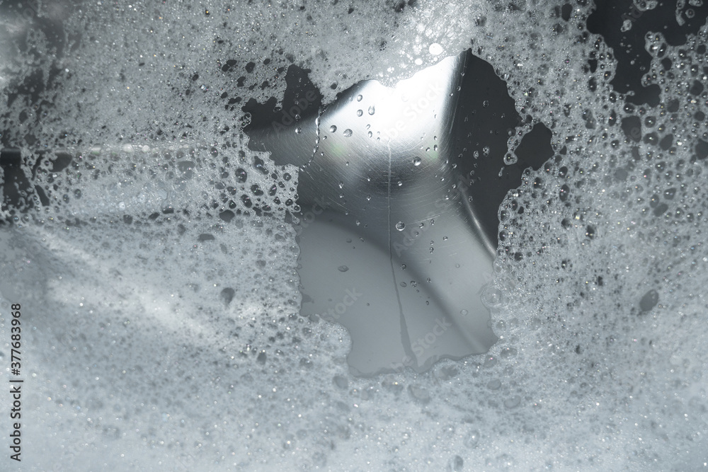 white bubble foam and water in washing machine metal material background