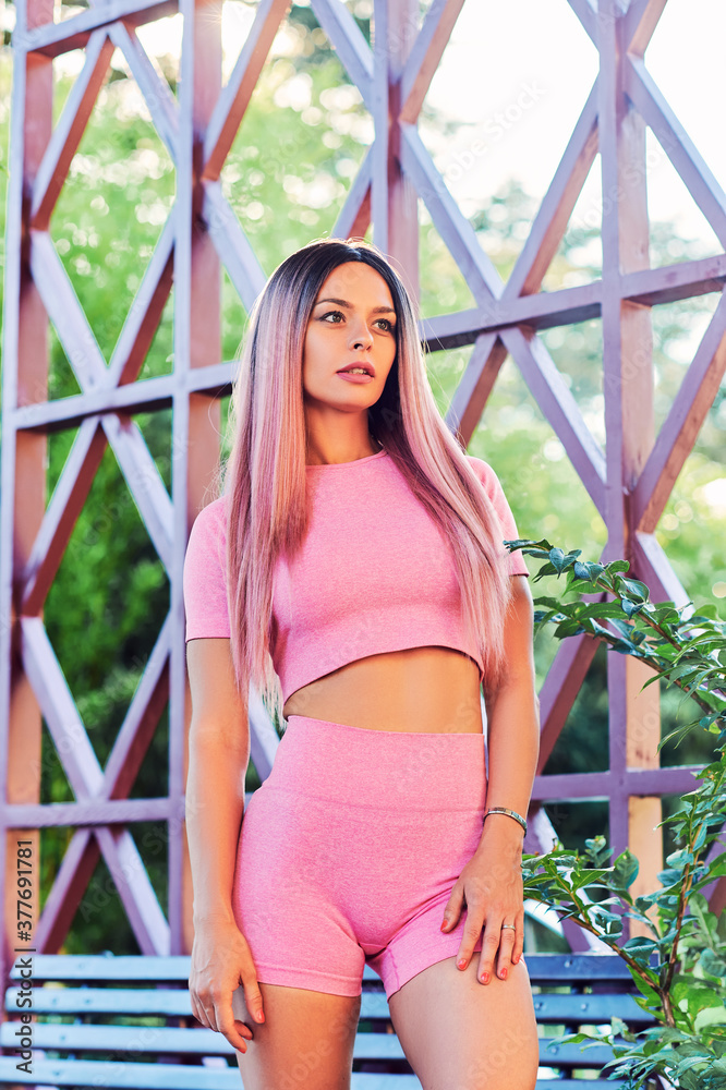 Portrait of beautiful young fit woman posing outside, sport, active, healthy female lifestyle