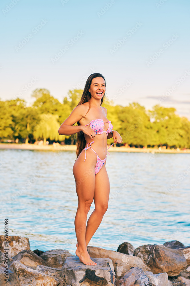 Outdoor portrait of beautiful young woman having fun by the lake, wearing pink bikini