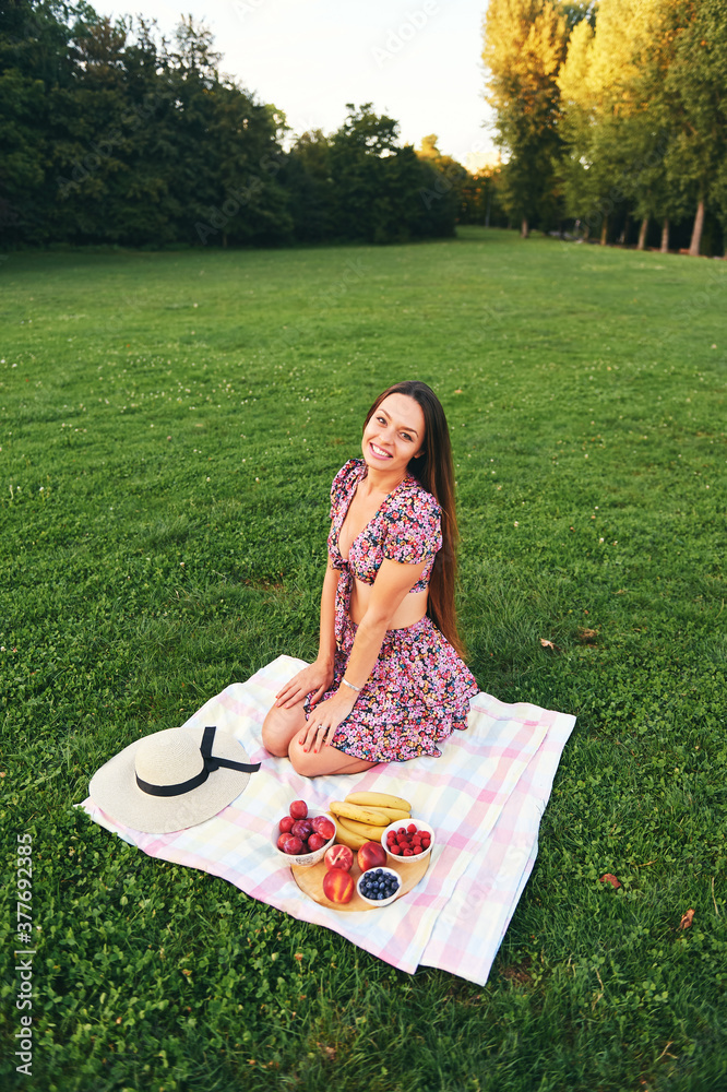 Outdoor portrait of beautiful young woman enjoying nice day in green park, healthy nutrition, fruit snack time