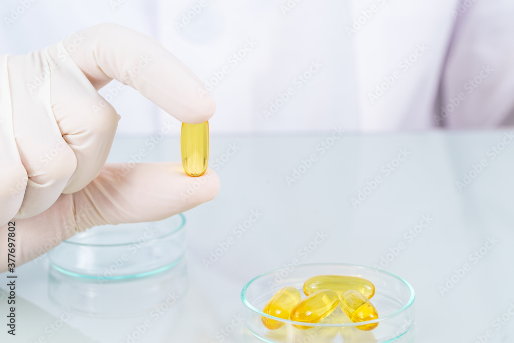 Close up Scientist holding Omega 3 capsule in labcoat