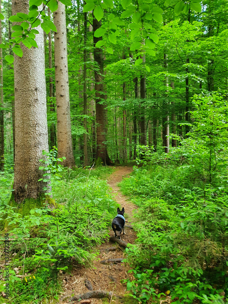 VERTICAL: Little miniature pinscher dog walks along the empty hiking trail.
