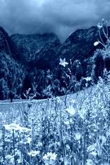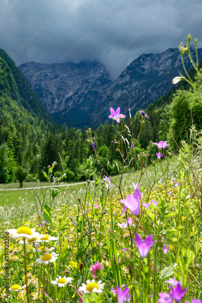 VERTICAL: Colorful flowers blossom in the middle of a grassfield in Logar Valley