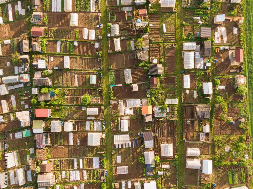 TOP DOWN: Flying over little fields and greenhouses of a garden in Slovenia.