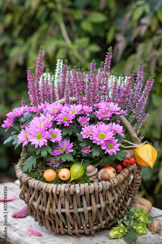 lila Chrysantheme und Heidekraut im Korb als Herbst-Gartendekoration