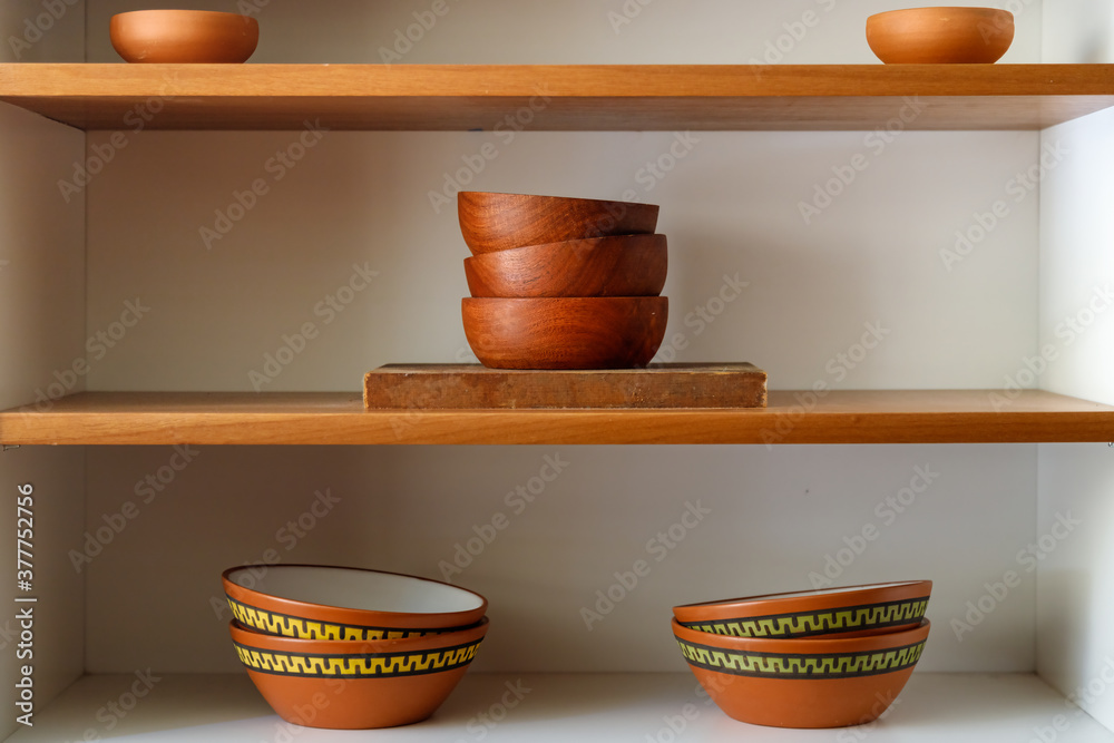 Clay and wooden bowls on shelf of a kitchen