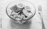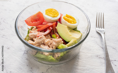 Angled closeup of healthy salad in glass bowl with tuna, egg, avocado, tomato and lettucs on marble effect background with fork (selective focus)