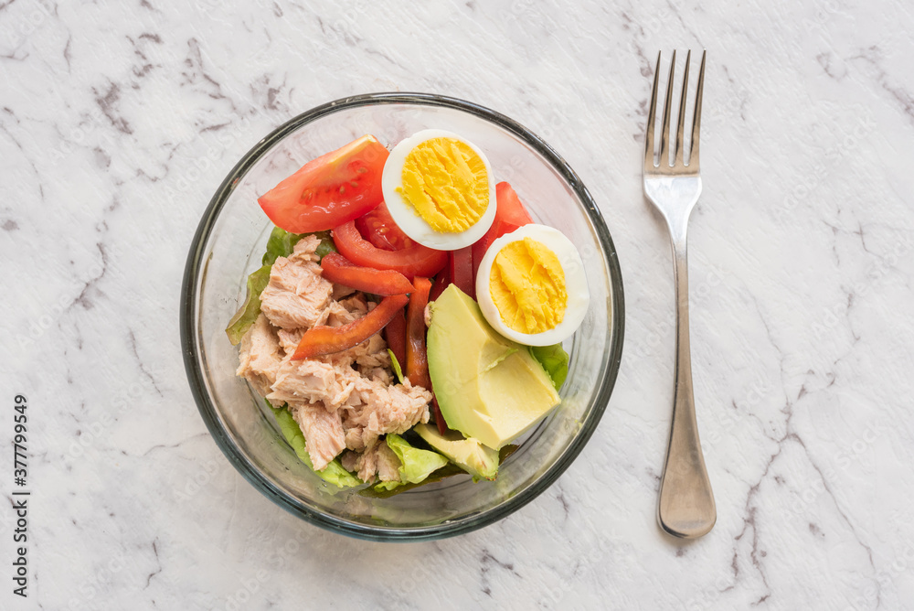 Top down closeup of healthy salad in glass bowl with tuna, egg, avocado, tomato and lettucs on marble effect background with fork (selective focus)