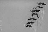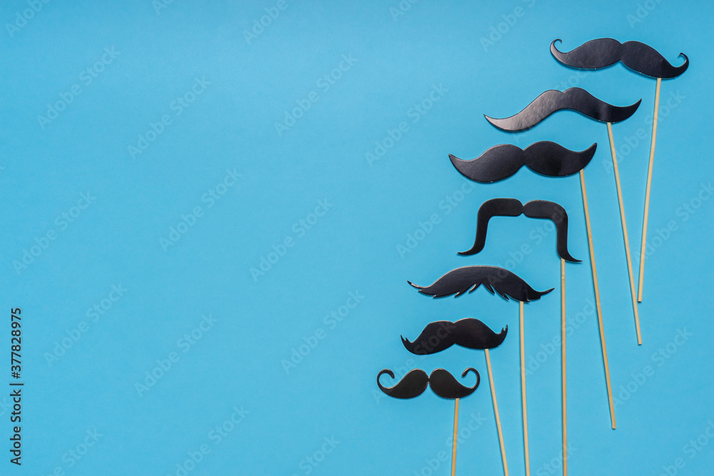 Various black photo booth props moustaches of different shape on blue background. Greeting card for father's day or men's health awareness month campaign concept. Flat lay, space for text, mock up
