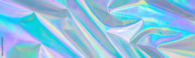 Blurred soft focused abstract trendy rainbow holographic banner background in 80s style. Blurred texture in violet, pink and mint soft pastel colors.