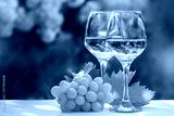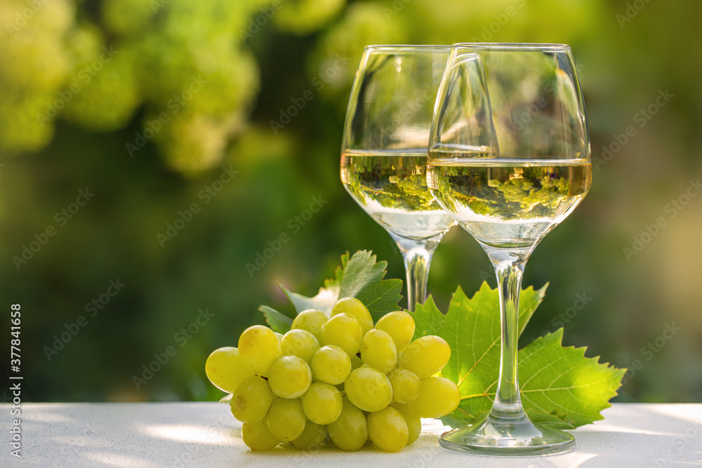 Two white wine glasses with grape and grape leafs. Garden in background. Copy space.
