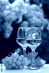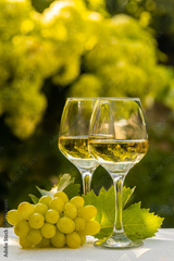 Two white wine glasses with grape and grape leafs. Garden in background.