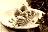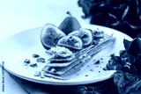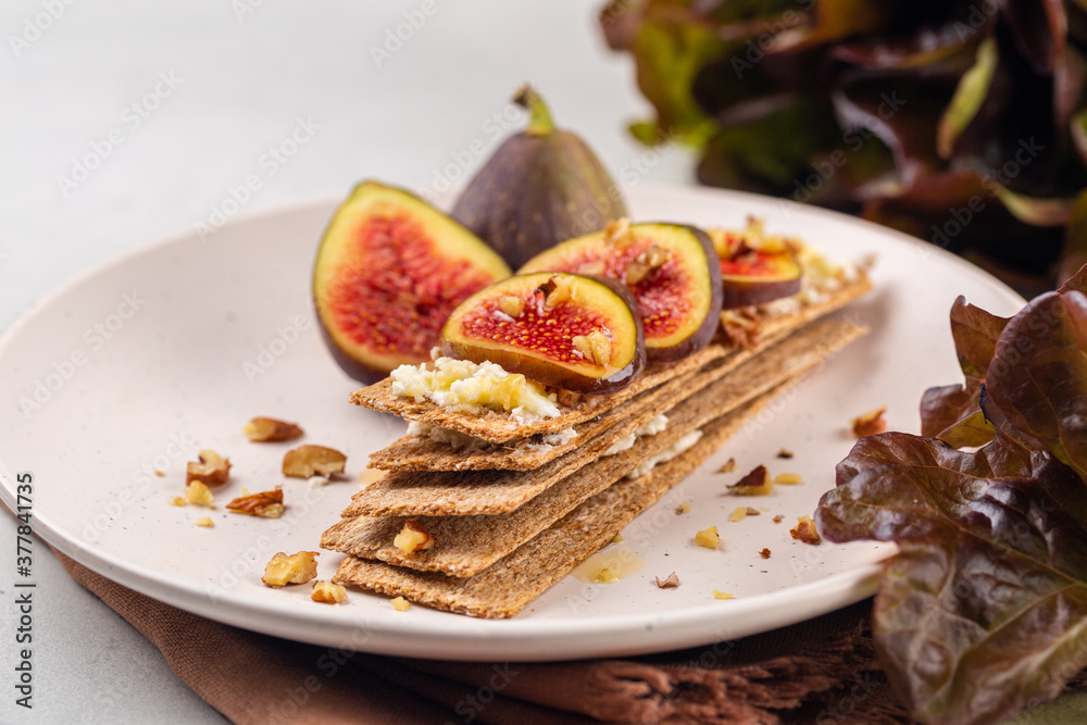 Whole grain crisp bread with soft cheese, figs, walnuts and honey. Healthy breakfast concept. Decorated with salad lives. Close up.