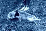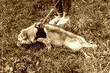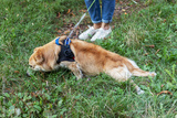 Woman walking a dog with disability. Dog with paralyzed hind paws on a walk in park.
