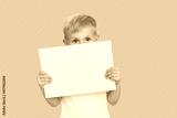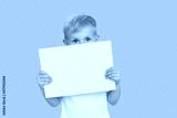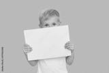 A cute laughing child boy is holding a white signboard with an empty space for text. Advertising of childrens products and the announcement of discounts and sales